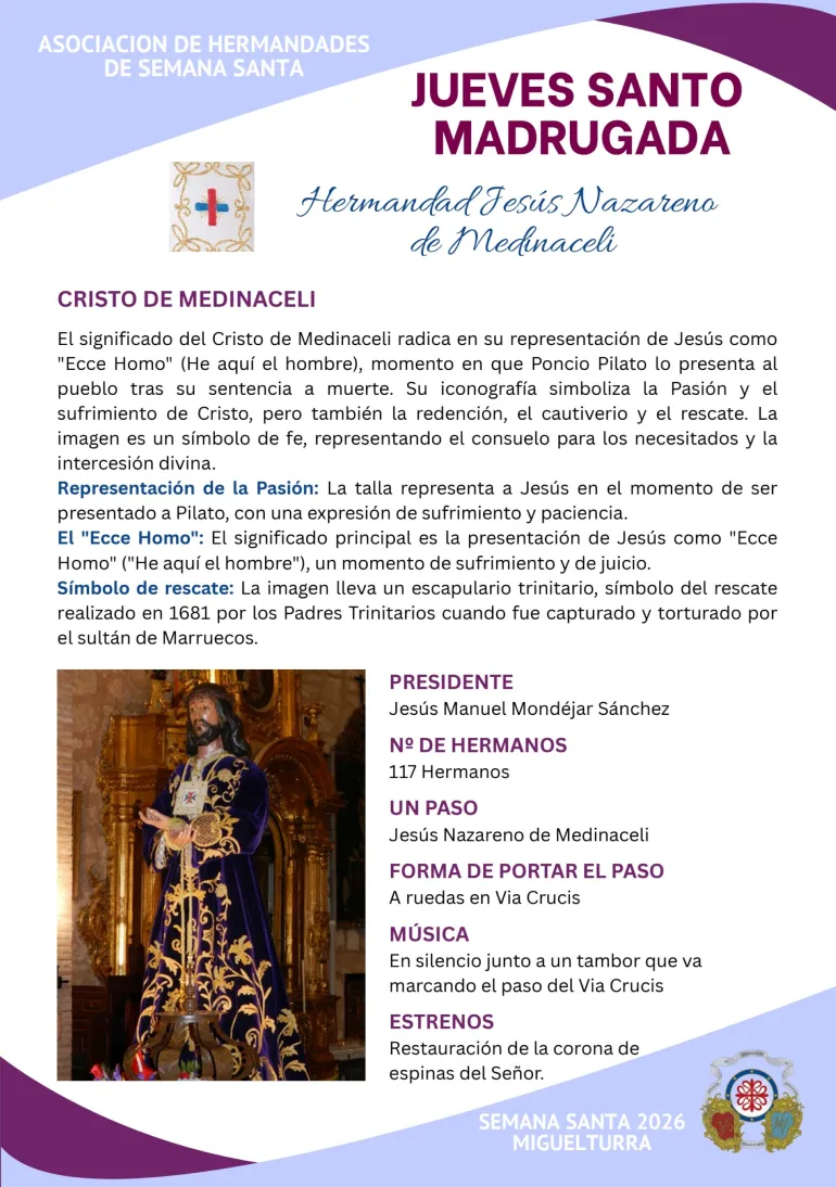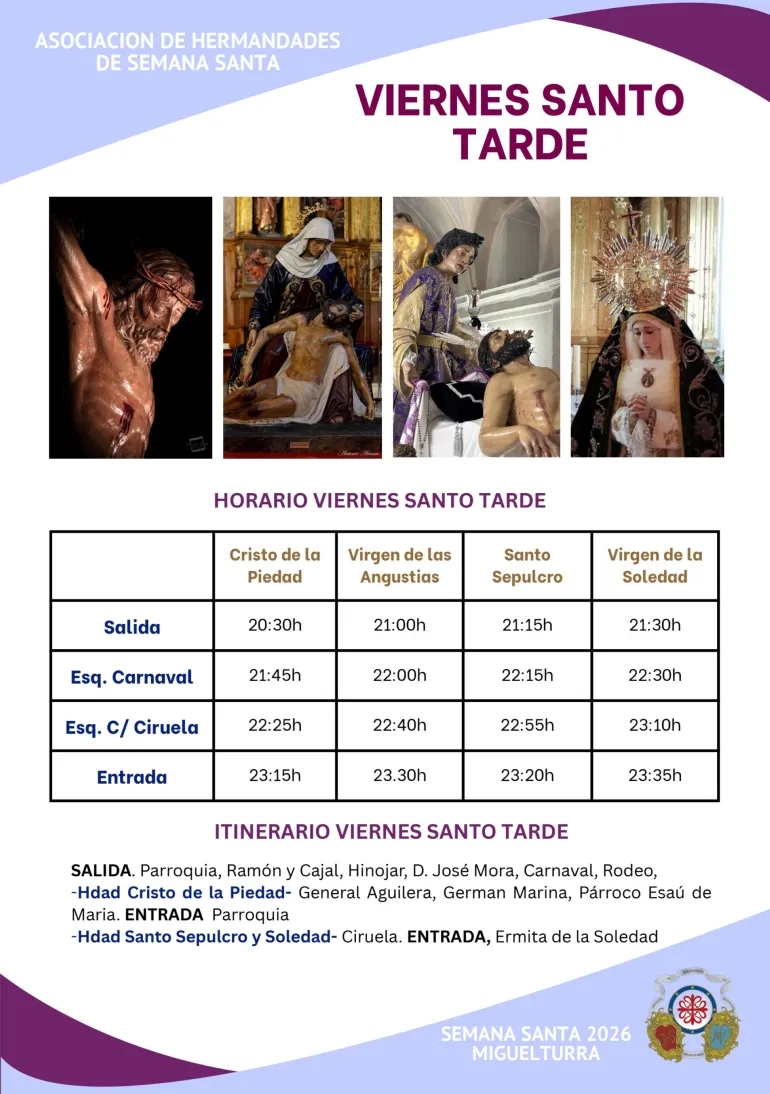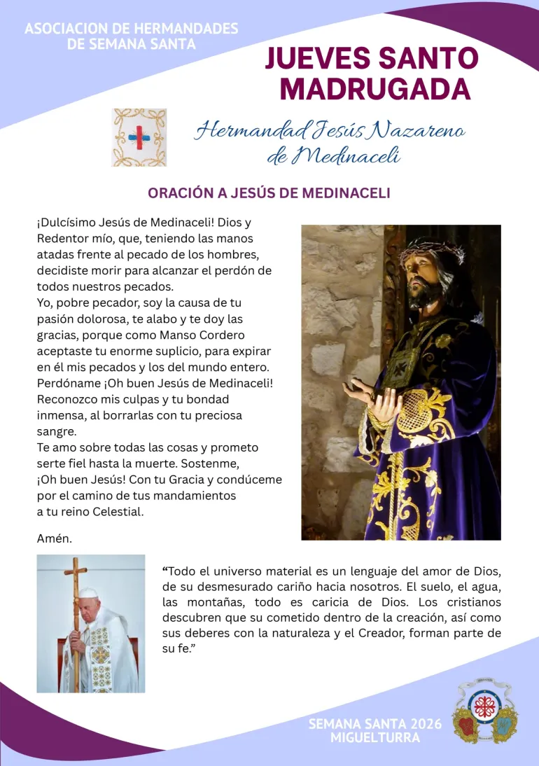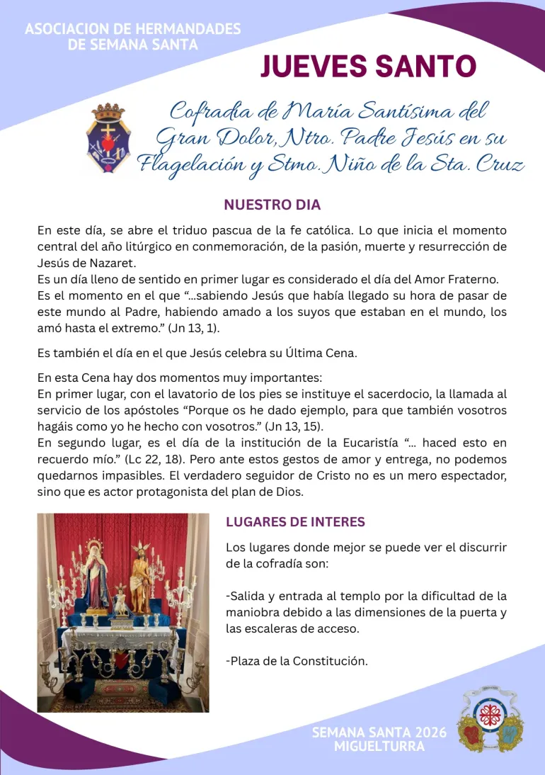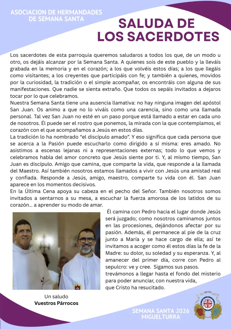A continuación les dejamos a su disposición el programa completo correspondiente a la Semana Santa de Miguelturra 2026, tanto en imágenes como el documento en formato PDF, esperando sea de su interés, y cuyos actos principales se desarrollarán del viernes 27 de marzo al domingo 5 abril de 2026.