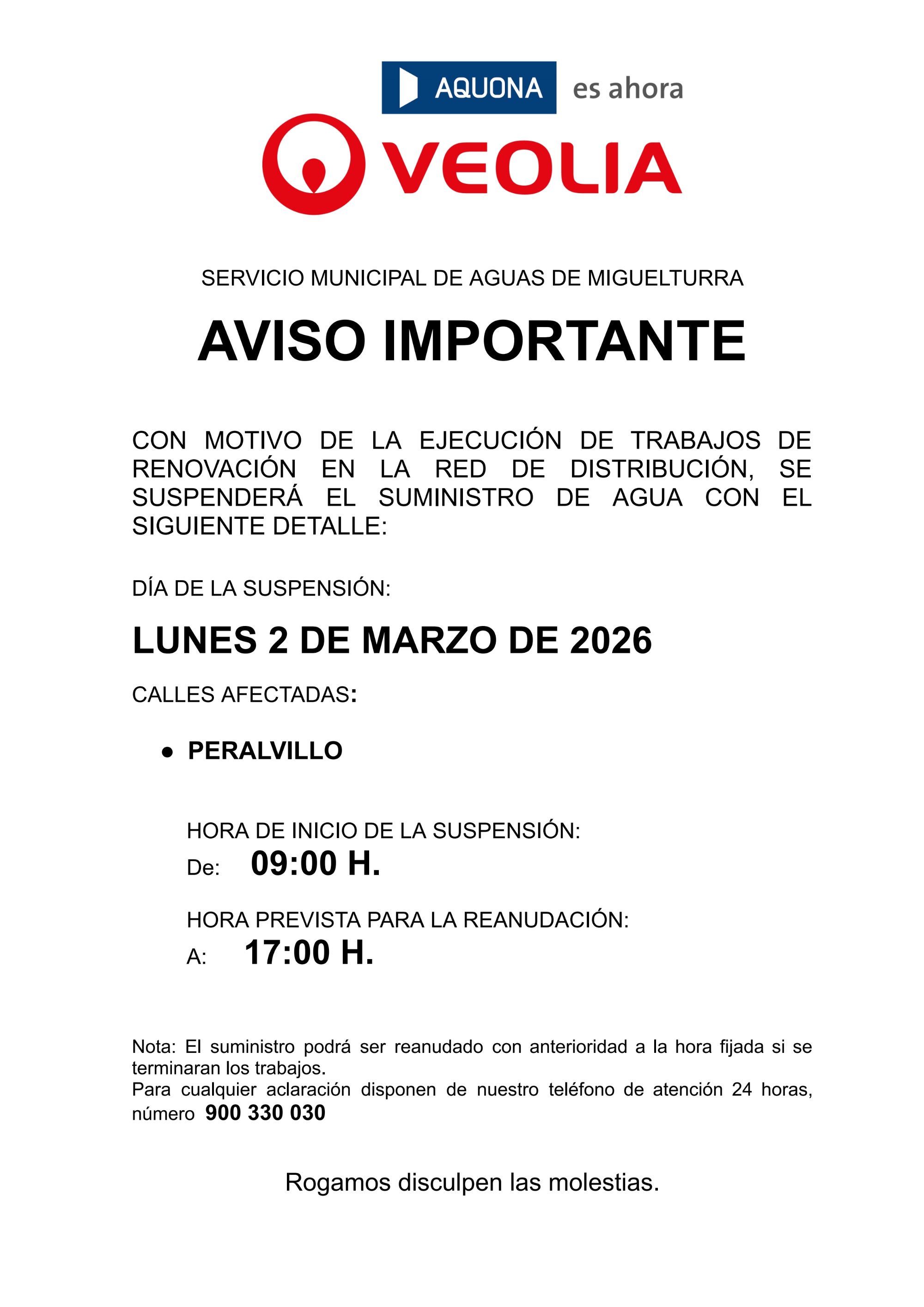 CON MOTIVO DE LA EJECUCIÓN DE TRABAJOS DE RENOVACIÓN EN LA RED DE DISTRIBUCIÓN, SE SUSPENDERÁ EL SUMINISTRO DE AGUA CON EL SIGUIENTE DETALLE: