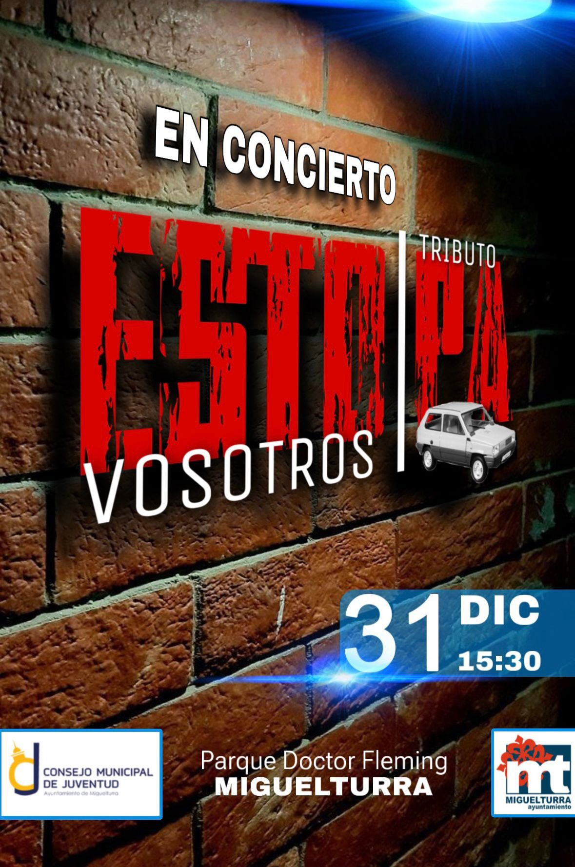 Dentro de los eventos programados por el área de Juventud para esta Navidad 2025 del Ayuntamiento de Miguelturra, el miércoles 31 de diciembre a las 15:30 horas podremos disfrutar de un especial concierto de música "Tributo a EstoPA' vosotros" en el parque Doctor Fleming tras la celebración de las "Campanadas Churriegas 2026", evento en el que colabora el Consejo Municipal de Juventud, esperando sea de su interés.