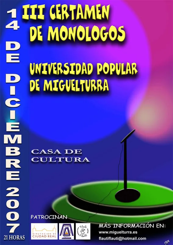 El próximo viernes 14 de diciembre a partir de las 21 horas en la Casa de Cultura de Miguelturra se celebrará la gran final del Tercer Certamen de Monólogos Universidad Popular, acto presentado por Pablo López, ganador del anterior certamen, y en el que también actuará el grupo Quinta Pared.